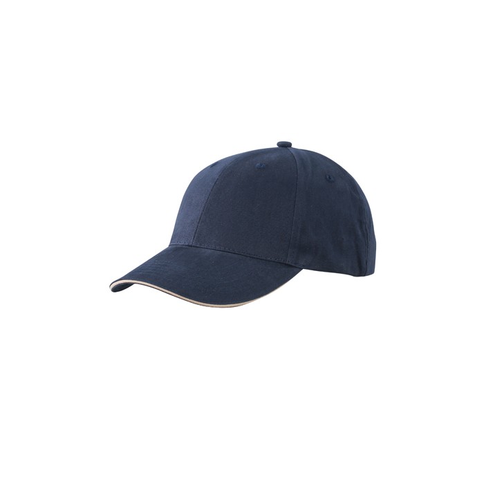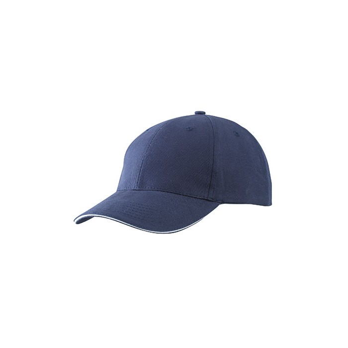 High-quality light and soft 6-panel sandwich cap | Brushed cotton | Clip fastener with metal eyelet | Six embroidered air holes | 6 decorative stitching lines on the peak | Front panels laminated | Padded satin sweatband