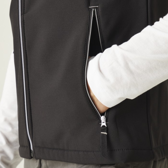Polyester Softshell fabric with mechanical stretch | Printable wind & water repellent softshell outer fabric, with warm fleece lining | 2 lower zipped pockets & inner zip guard | Made using recycled materials