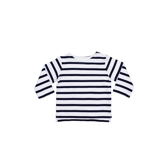 Organic or in Conversion to Organic cotton | 16mm x 8mm yarn dyed stripes | Nickel-free navy poppers to shoulder opening for easy dressing | Locker patch | Side vents | Drop Tail | Soft and stretchy fabric | Tear-away label