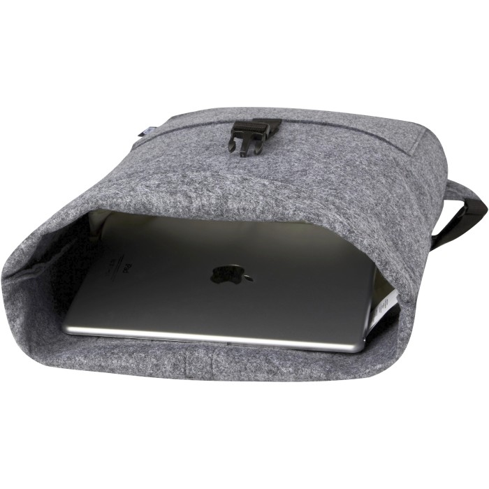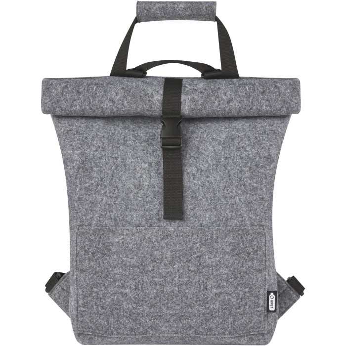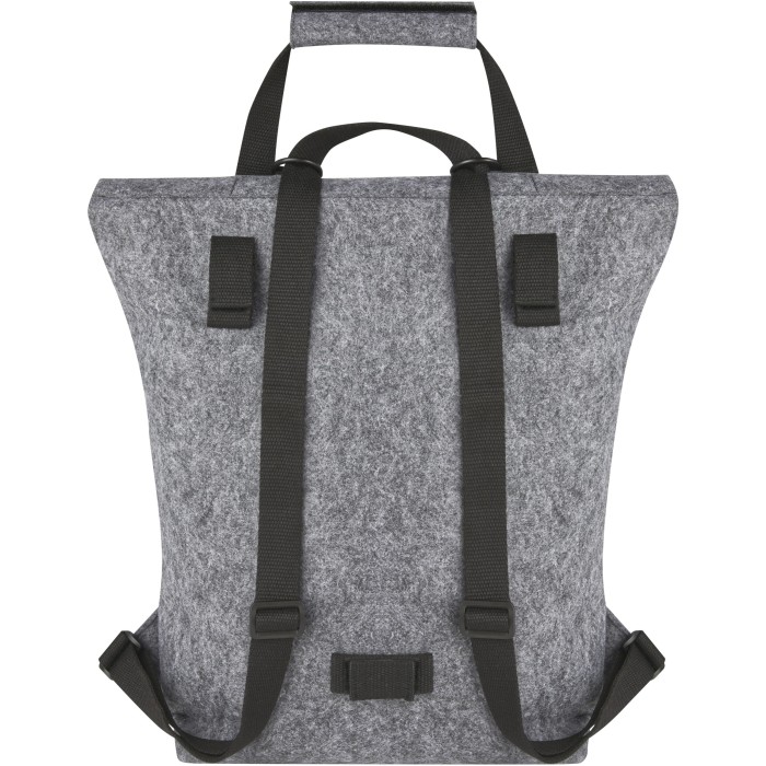 Multifunctional and fashionable rolltop backpack and cycle bag in one | Made from high-quality, soft and durable certified recycled felt | One large main compartment and one front pocket | Adjustable shoulder straps and 3 hook-and-loop straps with which the bag can be attached to a bicycle's luggage rack | The shoulder straps can be easily converted into a long carry handle system or be bundled so that the straps can't get trapped in a bicycle wheel | Capacity: 13 litres