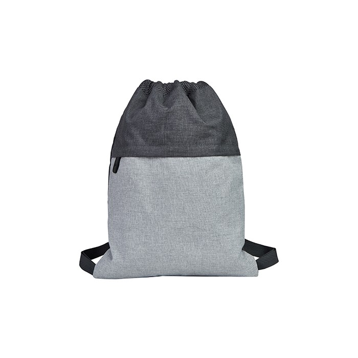 600D polyester gym bag in mottled-effect dark and light grey | A large main compartment that can be closed by pulling the dark grey, side shoulder straps together | Spacious front pocket with concealed zip | Drawstring in dark grey air mesh | Black zip, the rubber zip puller is embossed with the "bags2GO" logo | Capacity: approx. 1.5 litres | Delivery without decoration/content