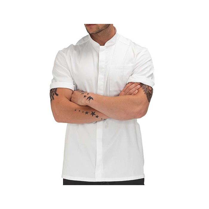 Short sleeved, single breasted jacket with Staycool centre back | Features concealed placket with press studs and new apron holder tab system to reduce friction | Sleeve pen pocket and breast pocket