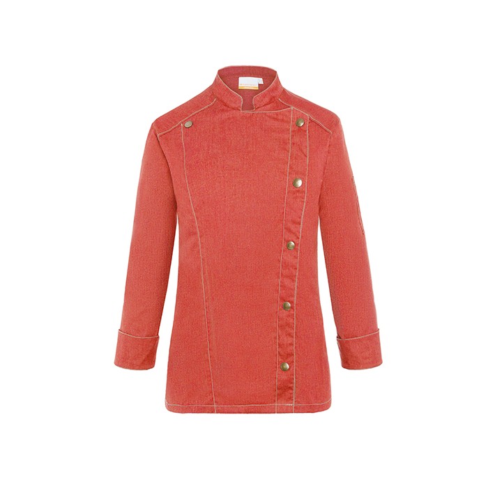Twill weave, 195 g/m² (vintage red: 175 g/m²) | Highly refined, pre-shrunk, colorfast, easy-care | Trendy women's chef jacket in jeans look with slim silhouette | Contrasting seams for the classic denim look | Asymmetrically fastening, single-row five-button jacket with press studs for quick fastening and unfastening | Vented cuffs | patched pocket on the left sleeve with practical pen pocket | Suitable for industrial laundering