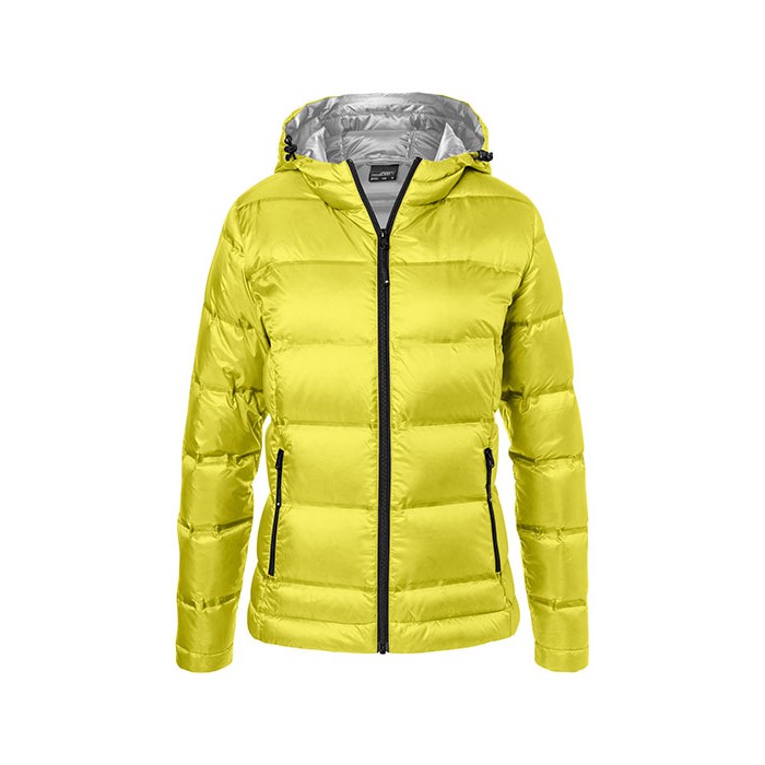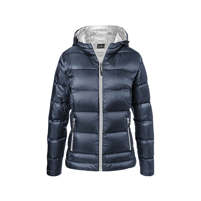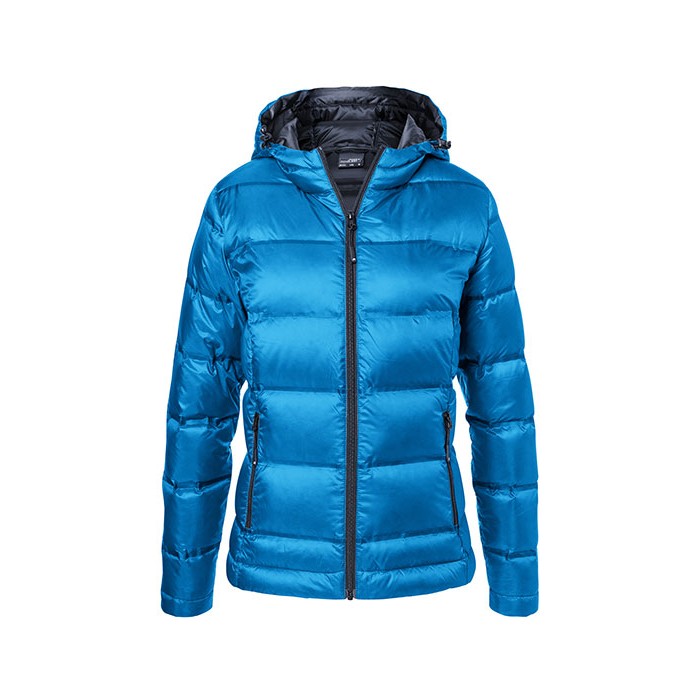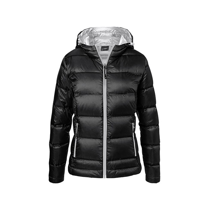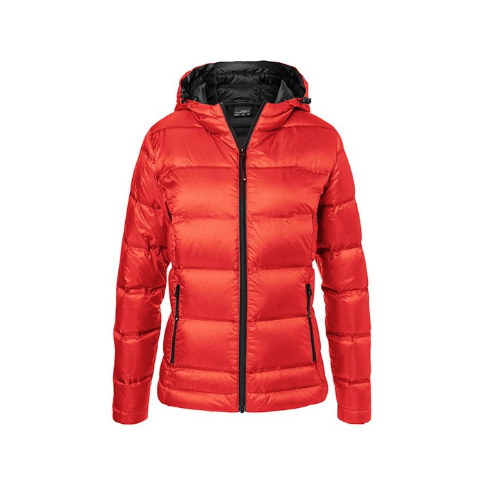 Hooded down jacket in new design, Back-stitching of the jacket is taped, not sewn | Soft, light wind- and water-repellent fabric | Contrasting inner lining and zips | Two side pockets with zip | 2 inner pockets | Attached, adjustable hood | Cord with stopper on waistband for size adjustment | YKK-zips | Slightly fitted
