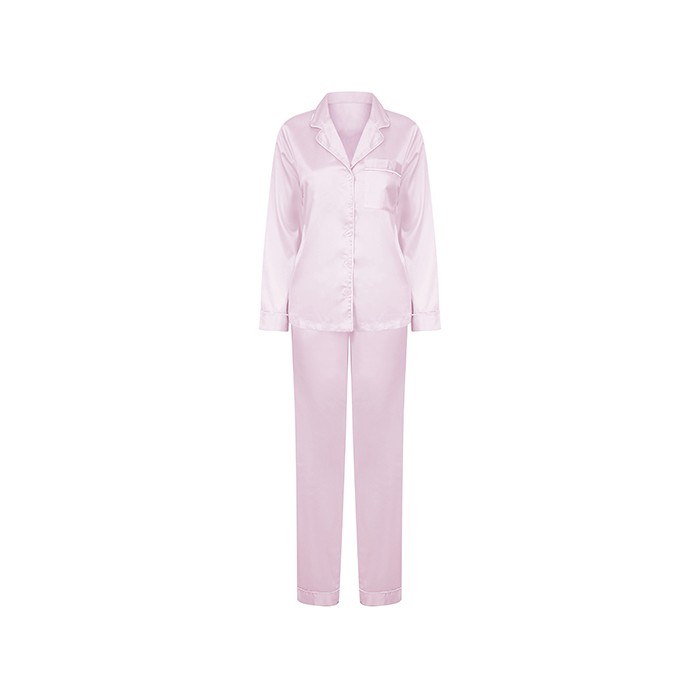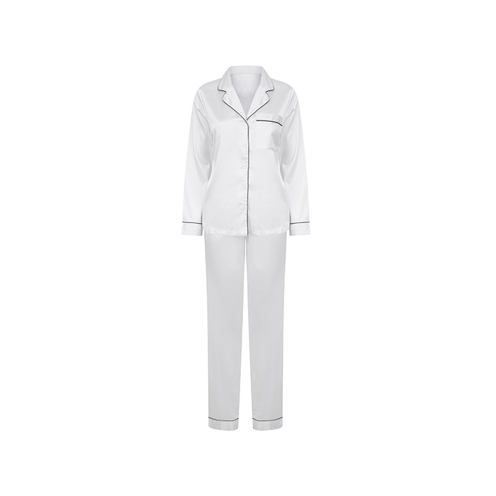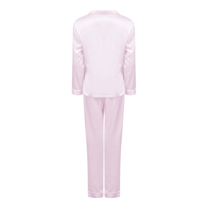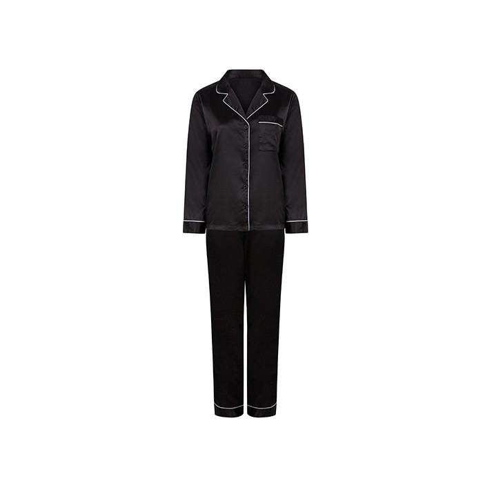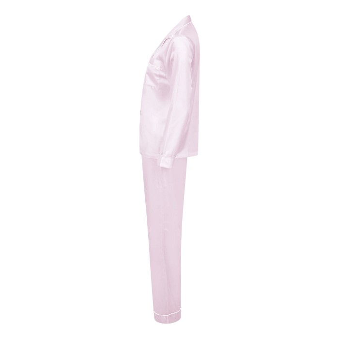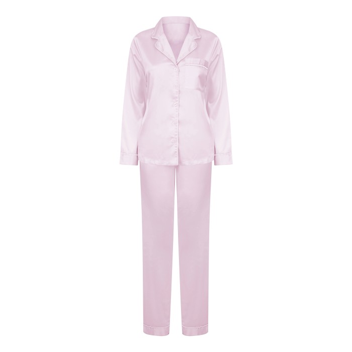 Stretch Satin long sleeved shirt and long pants pyjama set | Centre front button fastening down the centre front | Front breast pocket | Contrast piping detail | Pants with elasticated waistband and self fabric drawcord