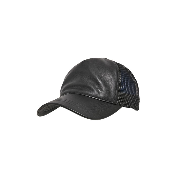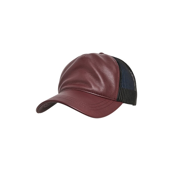 Front features a soft leather look | Pre-curved visor | Decorative stitching | Back is made of mesh | Adjustable closure