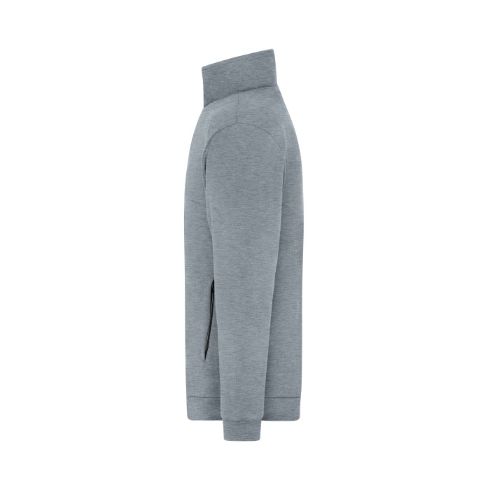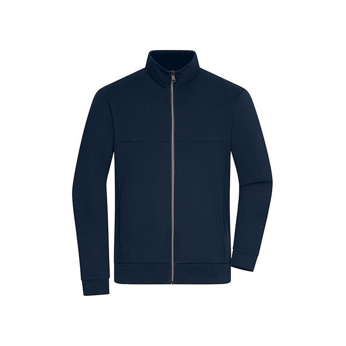 Shape-retaining interlock material made from cotton and polyester with elastane | Full front zipper, stand up collar | 2 concealed zipped side pockets, 2 inner pockets | Body and sleeve cuffs with waistband