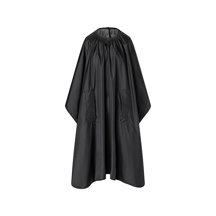 Linen fabric, 100% polyester, coated with silver polyurethane (PU), 95 g/m² | Waterproof professional barber's cloak with user-friendly arm openings | Effectively protects customers against water, dirt and hair dyes | With waterproof silver PU coating | Anti-static material properties prevent hairs from becoming attached | Stains can be removed by machine washing at up to 30°C | Convenient adjustable and elastic closure with metal clips on the neck hole | With practical hanger | Care instructions: Fully iron after at least every fifth wash to maintain the water-repellent protection of the outer fabric layer (low-temperature ironing, 110 °C maximum, no steam)