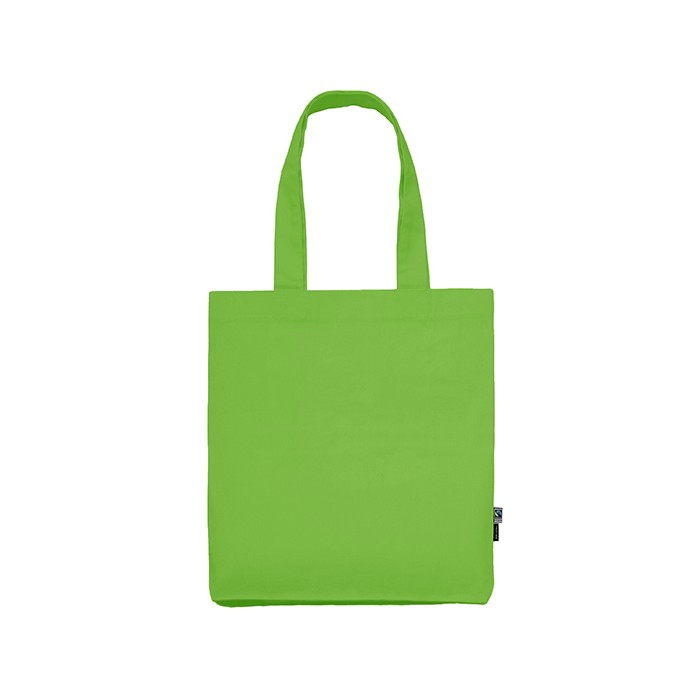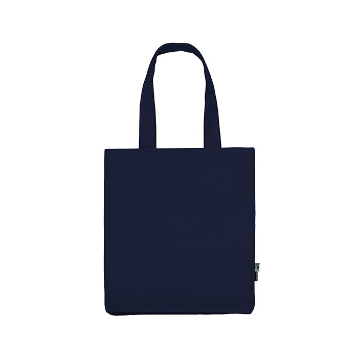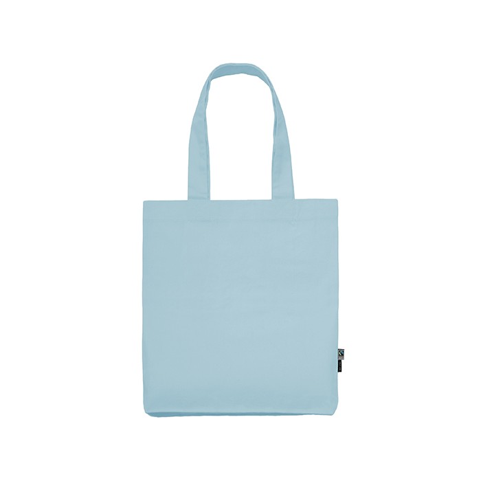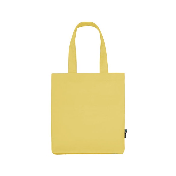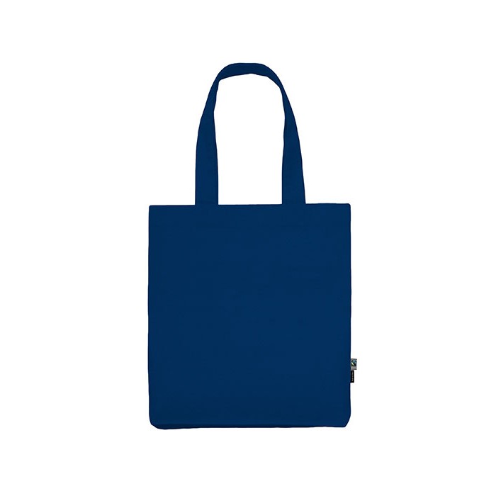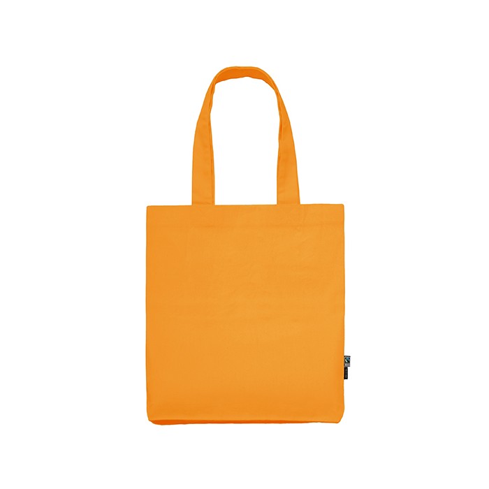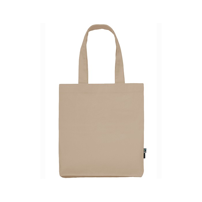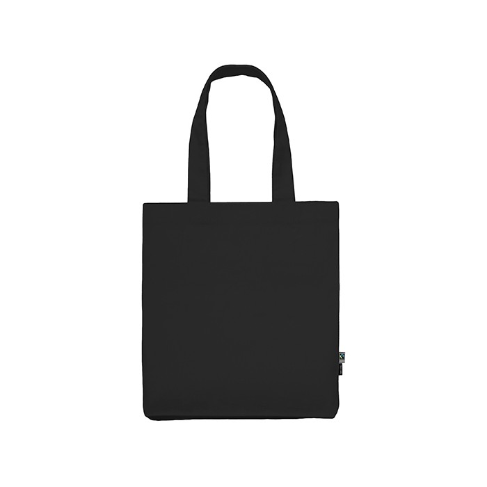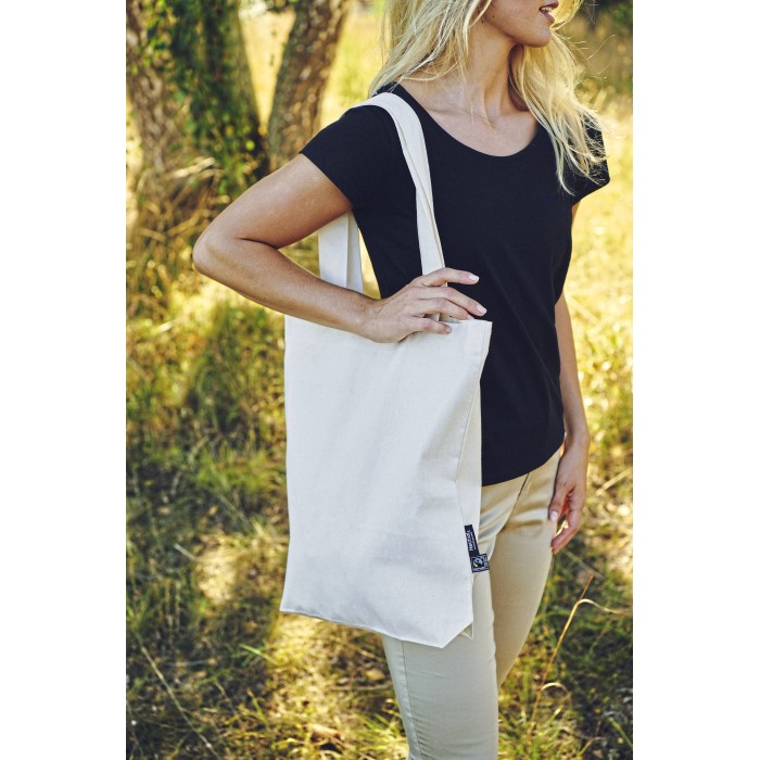 Fairtrade-certified cotton | Combed organic cotton | Twill weave | Long handles | Neutral and Fairtrade flag label at side | Delivery without content / decoration