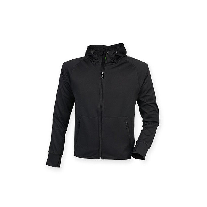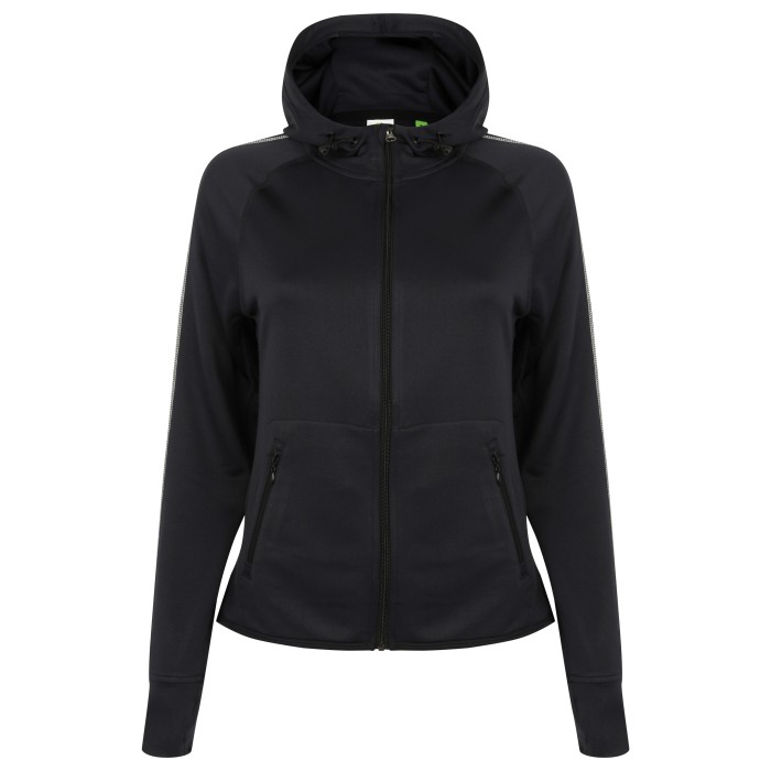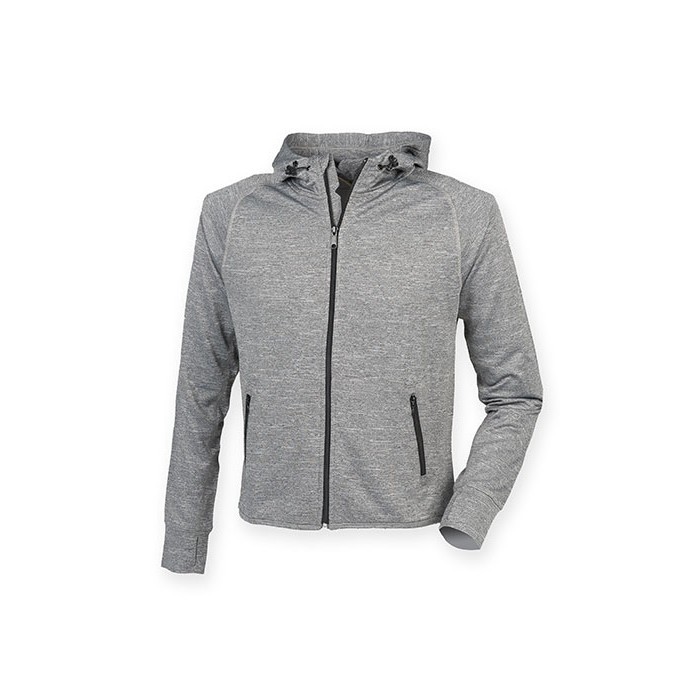 100% polyester french terry | Reflective tape down sleeve | Slim fit and lightweight | Raglan sleeve | Inner MP3 Pocket | Flatlock stitching | Thumb holes in self fabric cuffs | Funnel hood neck with drawcords and toggles | 2 zipped side entry pockets