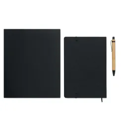 Zestaw notatników A5 w twardej okładce z filcu RPET z funkcją podstawki na telefon i długopisem z bambusowym korpusem. Oprawiony. 160 stron w linie (80 kartek) z papieru z recyklingu. Elastyczny pasek zamykający. Wstążkowa zakładka. Niebieski tusz.