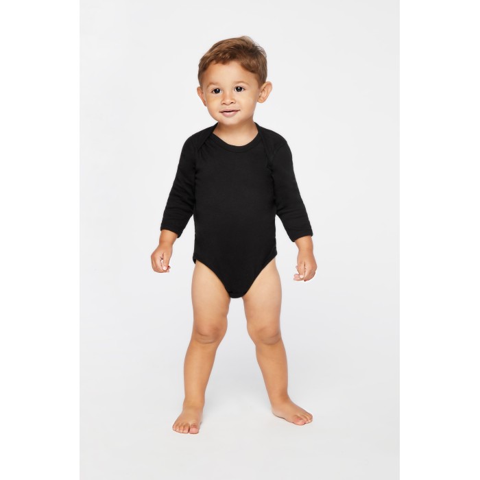Kopertowe wykończenie dekoltu | Oblamowany dekolt, ramiona, rękawy i nogawki | Wzmocnione zapięcie na trzy zatrzaski (plastikowe) | Metka EasyTear™ | 100% Przędza bawełniana czesana | Szwy boczne | Certyfikacja WRAP