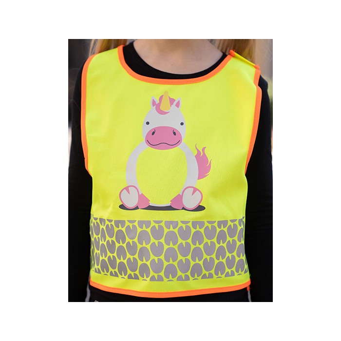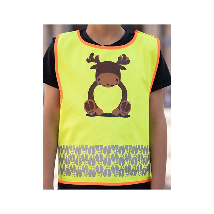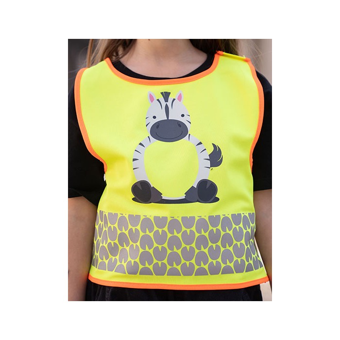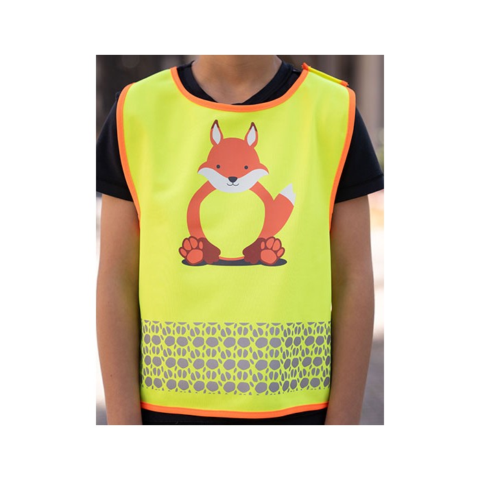 Dziecięca kamizelka ochronna z motywami zwierzęcymi | Część brzuszna zwierząt zapewnia łatwy do zadrukowania obszar | Segmentowe paski odblaskowe w kształcie odcisków łap | Praktyczne zapięcie na rzep z boku i na ramieniu | Certyfikat zgodności z normą EN 17353