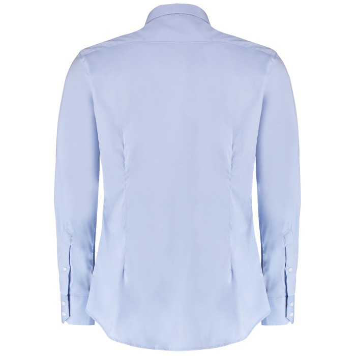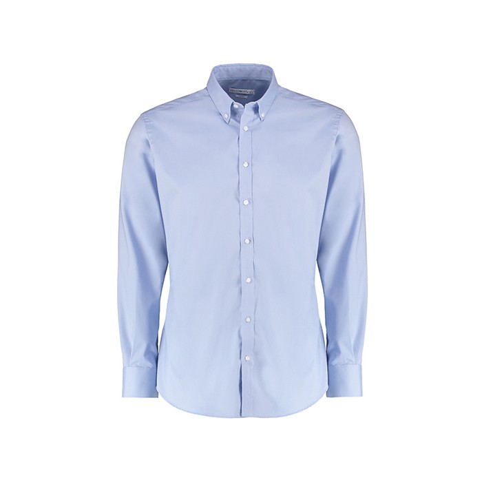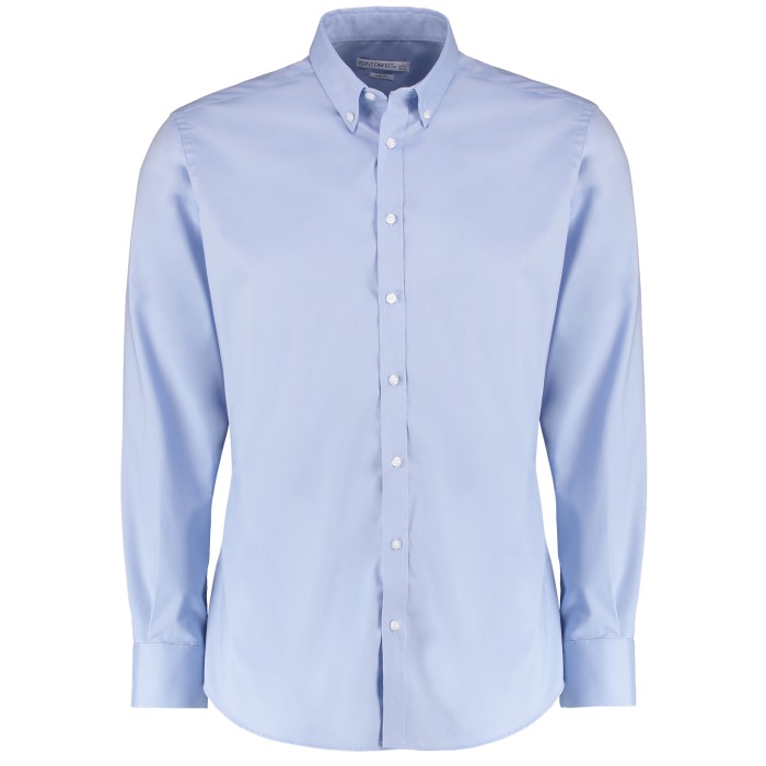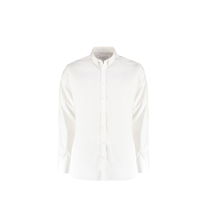 Usztywniony kołnierzyk button-down | Dwie zaszewki na plecach | Zaokrąglony dół koszuli | Karczek | Mankiet na dwa guziki z listwą na guziki | Karczek i wszycie rękawów wykończone pojedynczym ściegiem | Zapasowe guziki | Tkana metka Kustom Kit® na karku