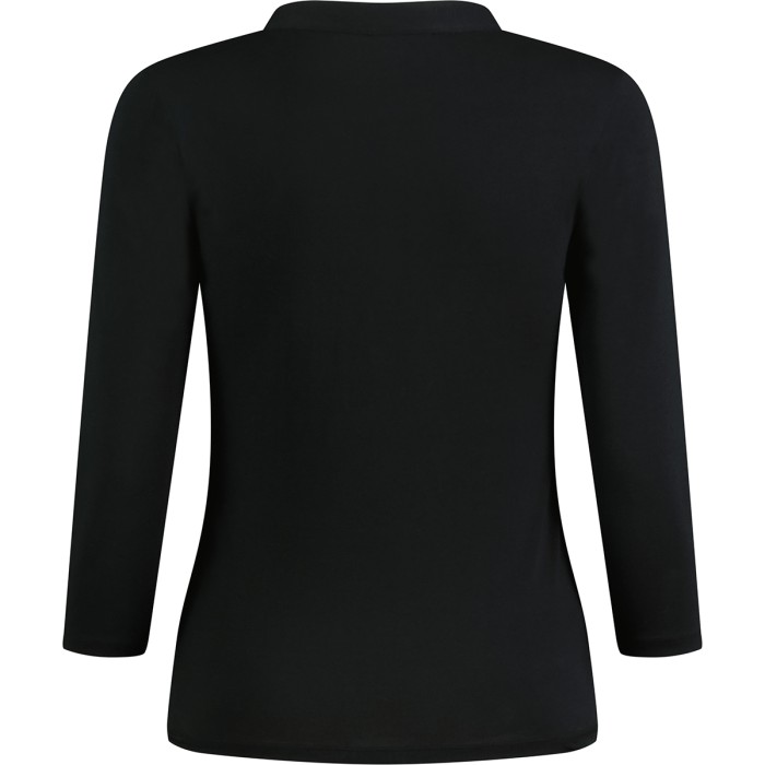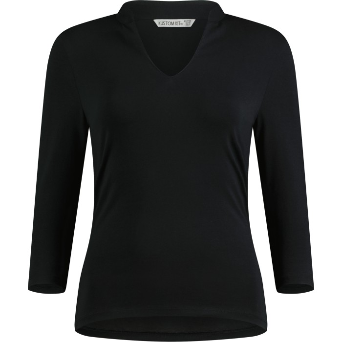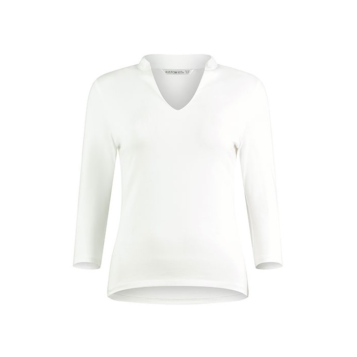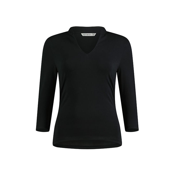 Prosty fason | Elastyczny materiał | Rękaw 3/4 | Szwy boczne | Prosty dół koszulki | Kołnierz typu stójka | Obramowanie wokół dekoltu z tego samego materiału | Klejone szwy na barkach z tego samego materiału | Podwójne szwy na mankietach i u dołu koszulki | Tkana metka Kustom Kit® na karku
