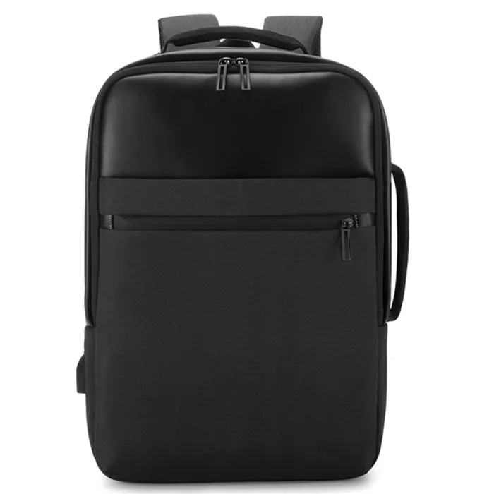 Górna część plecaka i fragment przedniej ścianki, wykonane z wysokiej jakości skóry ekologicznej, niezawodnie chronią zawartość przed wilgocią. Dwie komory zamykane są na suwaki z ukrytym zamkiem.