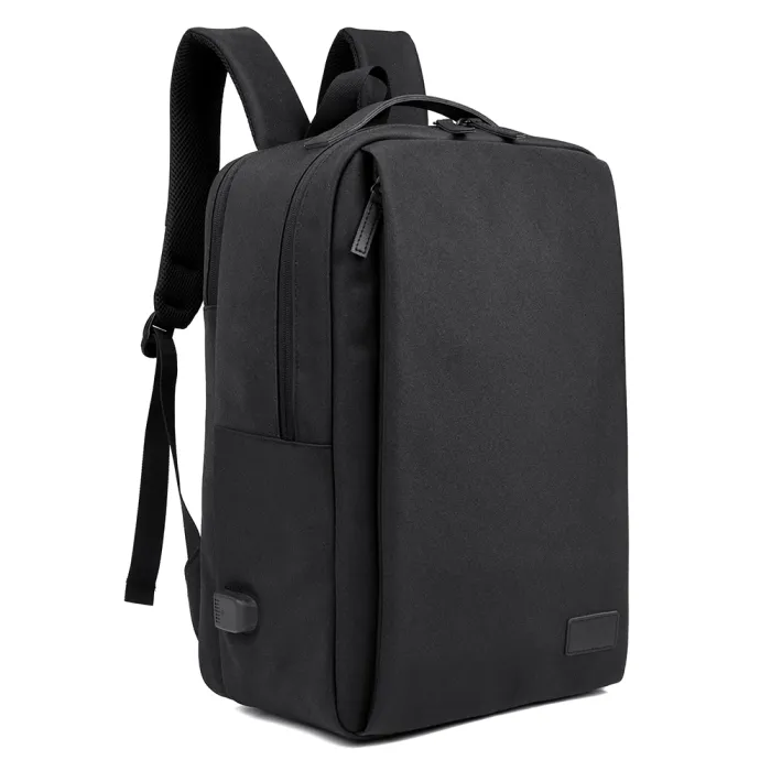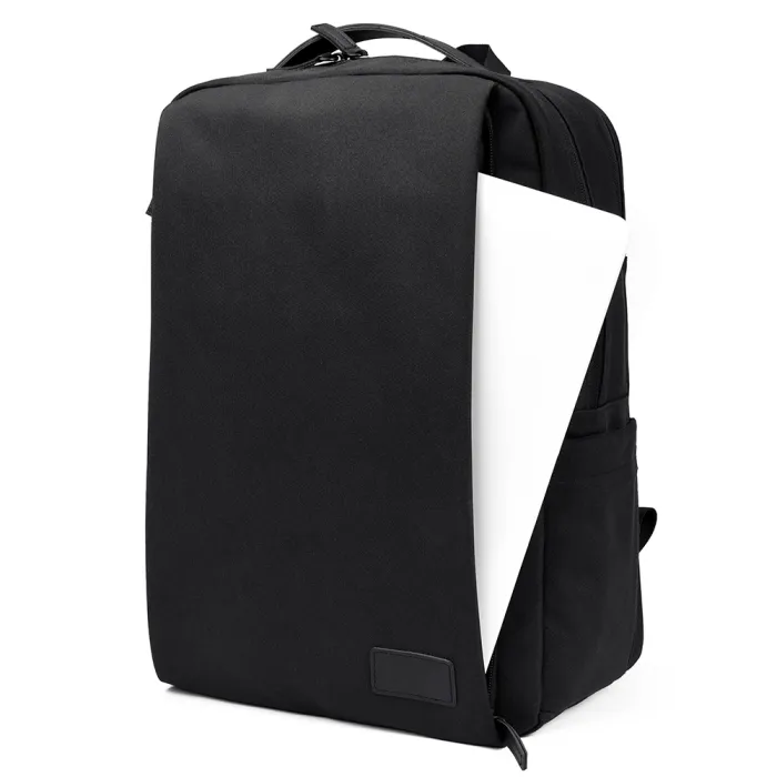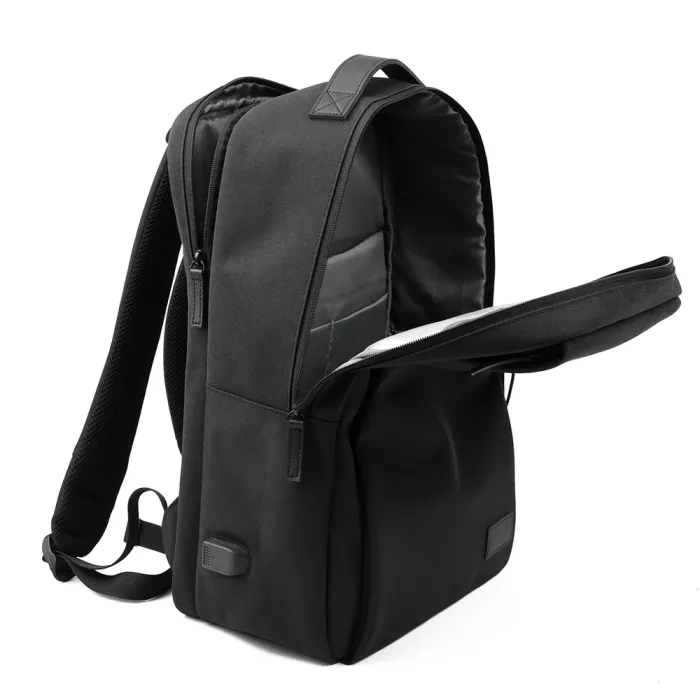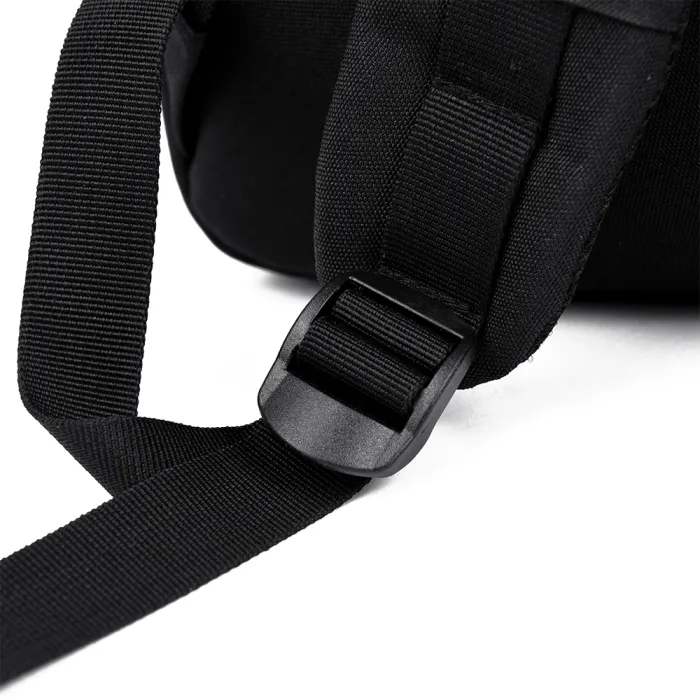 Wytrzymały poliester 900D uzupełniony jest brutalistycznymi elementami z ekologicznej skóry. Dwie komory plecaka zamykane są na suwaki z ukrytym zamkiem.